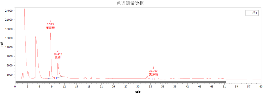 新標(biāo)準(zhǔn)要求明確標(biāo)示糖含量 哪種檢測(cè)方法能精準(zhǔn)檢測(cè)糖含量呢? GB 5009.8-2023《食品安全國(guó)家標(biāo)準(zhǔn)食品中果糖、葡萄糖、蔗糖、麥芽糖、乳糖的測(cè)定》明確了食品中五種糖的檢測(cè)方法,其中離子色譜法作為第二法適用于全品類食品果糖、葡萄糖、蔗糖、麥芽糖、乳糖的測(cè)定,是應(yīng)用范圍最廣的檢測(cè)方法。 盛瀚解決方案 儀器配置: CIC-D200E糖檢測(cè)專用儀 ?高通量自動(dòng)進(jìn)樣器 60、120位進(jìn)樣器可選,樣品處理量多,效率更高; 全定量、部分進(jìn)樣、無損進(jìn)樣等多種進(jìn)樣方式可選,滿足不同用戶使用場(chǎng)景。 ?電化學(xué)檢測(cè)單元 直流、脈沖、積分三種模式可選,選擇更靈活; 內(nèi)置柱溫箱,連接死體積更小,出峰分辨率更佳; ?高效梯度混合泵 多通路流路自動(dòng)混合,精度高、易控制、更省心; 耐腐蝕,流路pH范圍0~14,可適用多種有機(jī)溶劑,性能優(yōu)異。 SH-CAC-200 色譜柱可以快速高效地分離單糖、雙糖,具有理想的分離度;與脈沖安培檢測(cè) (PAD) 相結(jié)合,在高 pH 條件下可進(jìn)行高分辨率的分離,無需衍生化。 前處理方法: ①稱取試樣2g(精確至0.001 g)于100 mL比色管中,加入約50 mL 50℃~60℃熱水,渦旋或攪拌 ②待樣品充分溶解,加入2 mL乙酸溶液,渦旋混勻,超聲30 min ③轉(zhuǎn)移至100 mL容量瓶中并用水定容至刻度,混勻,靜置20 min ④依次過0.45 μm水性濾膜針頭過濾器和C18固相萃取小柱 色譜條件: 樣品譜圖: (標(biāo)準(zhǔn)溶液譜圖 點(diǎn)擊圖片可放大查看) (樣品1溶液譜圖 點(diǎn)擊圖片可放大查看) (樣品2局部放大譜圖 點(diǎn)擊圖片可放大查看)