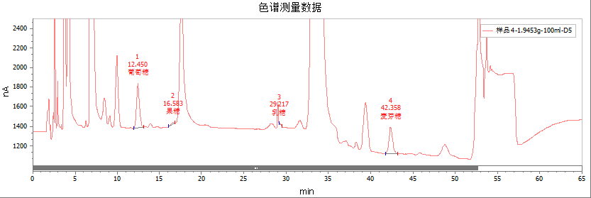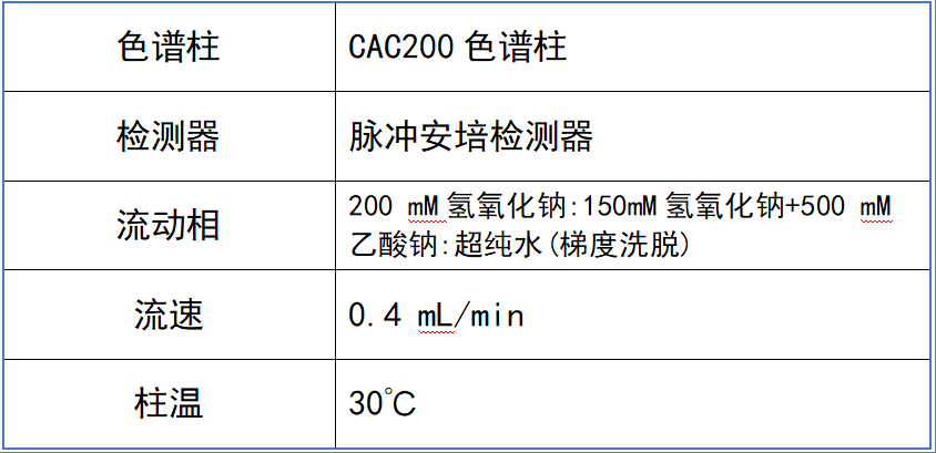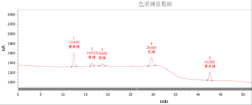 新標(biāo)準(zhǔn)要求明確標(biāo)示糖含量 哪種檢測(cè)方法能精準(zhǔn)檢測(cè)糖含量呢? GB 5009.8-2023《食品安全國(guó)家標(biāo)準(zhǔn)食品中果糖、葡萄糖、蔗糖、麥芽糖、乳糖的測(cè)定》明確了食品中五種糖的檢測(cè)方法,其中離子色譜法作為第二法適用于全品類食品果糖、葡萄糖、蔗糖、麥芽糖、乳糖的測(cè)定,是應(yīng)用范圍最廣的檢測(cè)方法。 盛瀚解決方案 儀器配置: CIC-D200E糖檢測(cè)專用儀 ?高通量自動(dòng)進(jìn)樣器 60、120位進(jìn)樣器可選,樣品處理量多,效率更高; 全定量、部分進(jìn)樣、無損進(jìn)樣等多種進(jìn)樣方式可選,滿足不同用戶使用場(chǎng)景。 ?電化學(xué)檢測(cè)單元 直流、脈沖、積分三種模式可選,選擇更靈活; 內(nèi)置柱溫箱,連接死體積更小,出峰分辨率更佳; ?高效梯度混合泵 多通路流路自動(dòng)混合,精度高、易控制、更省心; 耐腐蝕,流路pH范圍0~14,可適用多種有機(jī)溶劑,性能優(yōu)異。 SH-CAC-200 色譜柱可以快速高效地分離單糖、雙糖,具有理想的分離度;與脈沖安培檢測(cè) (PAD) 相結(jié)合,在高 pH 條件下可進(jìn)行高分辨率的分離,無需衍生化。 前處理方法: ①稱取試樣2g(精確至0.001 g)于100 mL比色管中,加入約50 mL 50℃~60℃熱水,渦旋或攪拌 ②待樣品充分溶解,加入2 mL乙酸溶液,渦旋混勻,超聲30 min ③轉(zhuǎn)移至100 mL容量瓶中并用水定容至刻度,混勻,靜置20 min ④依次過0.45 μm水性濾膜針頭過濾器和C18固相萃取小柱 色譜條件: 樣品譜圖: (標(biāo)準(zhǔn)溶液譜圖 點(diǎn)擊圖片可放大查看) (樣品1溶液譜圖 點(diǎn)擊圖片可放大查看) (樣品2局部放大譜圖 點(diǎn)擊圖片可放大查看)